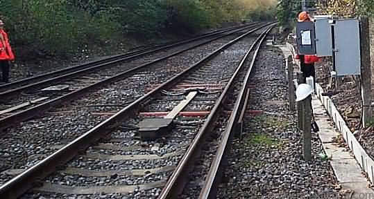 A track circuit is an electrical circuit where the running rails of a railway track form a part. Its primary purpose is to detect the presence of trains and control signaling and block equipment. At one end of the track circuit is a power source (battery) sends an electric current through the rails. At the other end it a relay monitors this current.